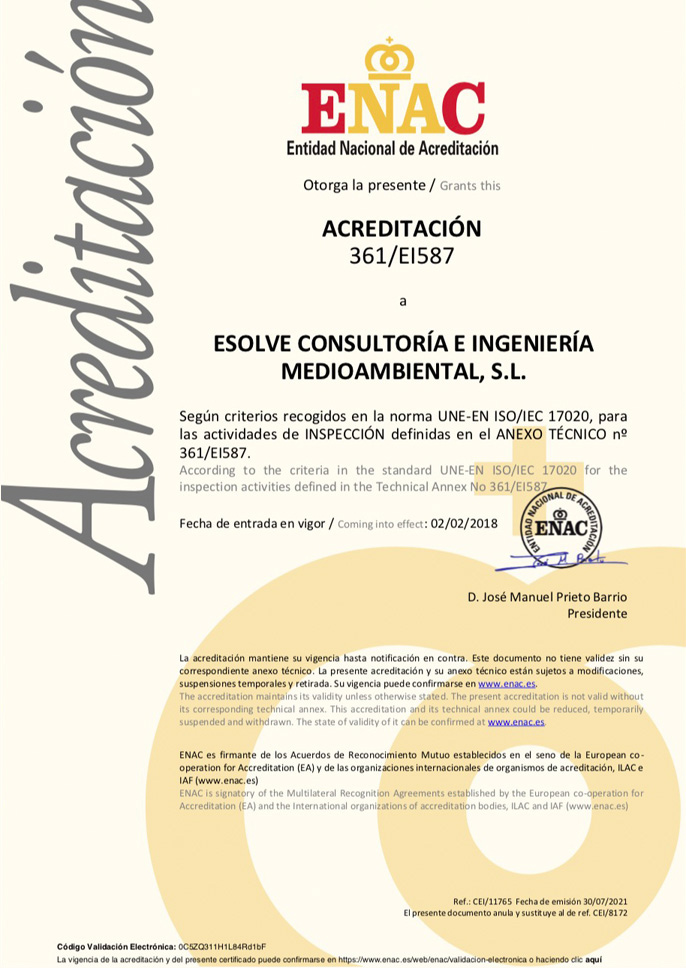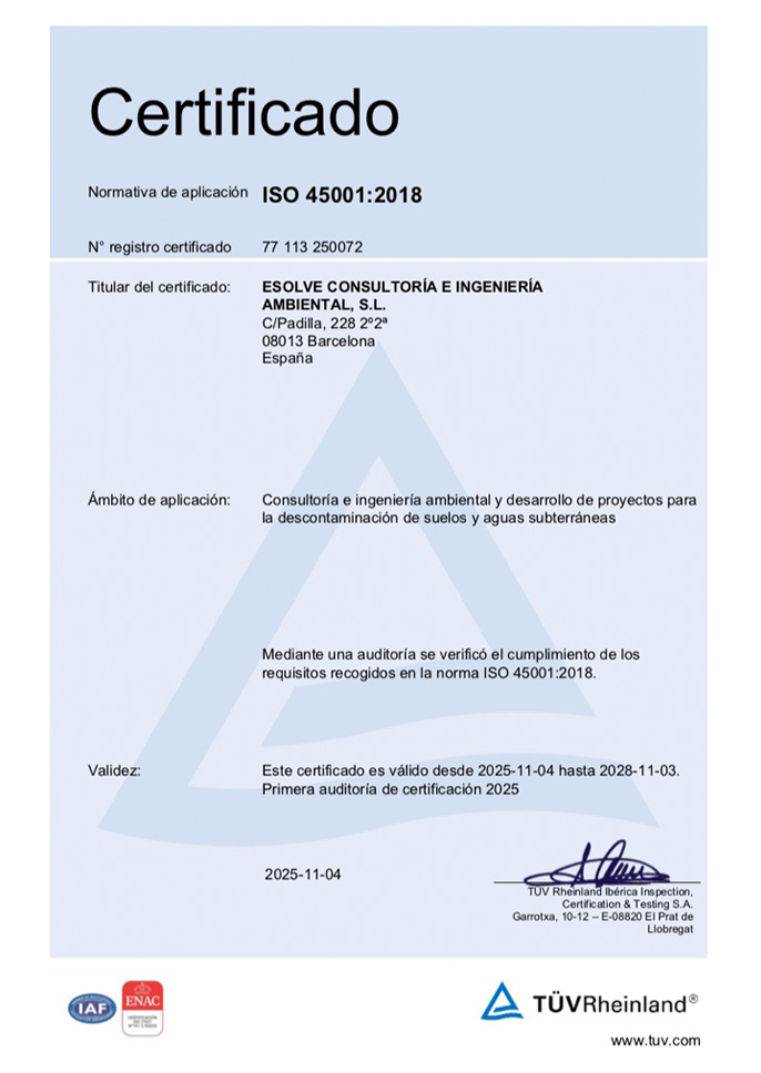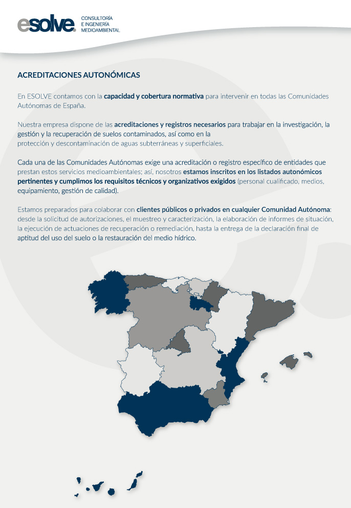 En ESOLVE trabajamos con el máximo rigor técnico y bajo el paraguas de la excelencia. Contamos con las acreditaciones y certificaciones oficiales necesarias para ejercer en España, además de la habilitación correspondiente para trabajar en aquellas Comunidades Autónomas que solicitan un registro específico como entidad reconocida por la Administración, todo ello, para ofrecer servicios como consultoría e ingeniería ambiental especializada en descontaminación de suelos y tratamiento de aguas contaminadas.